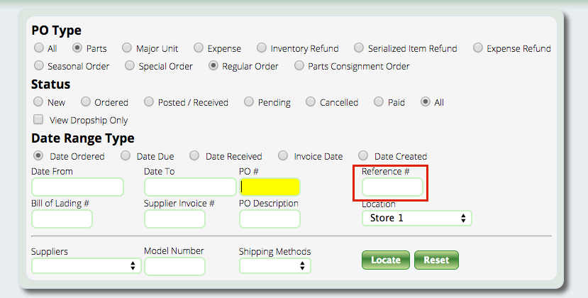 Next, you can locate the PO using the reference number. You can access this from Accounting > Payables > Locate an Order or Inventory > Process Items > Locate an Order.